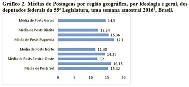 As médias de postagens também demonstram algumas diferenças, em que deputados(as) da região Sudeste e deputados(as) de esquerda sobressaem.