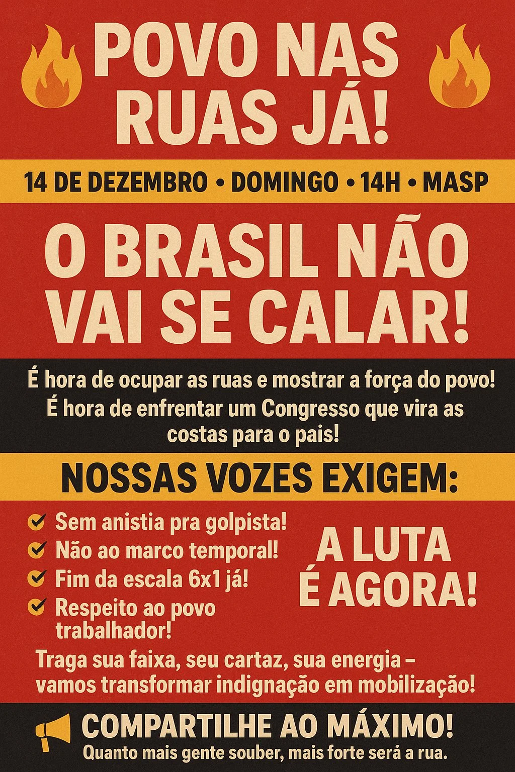 Imagens que circulam nas redes chamam a população às ruas com palavras de ordem como “Congresso inimigo do povo” e “Sem anistia pra golpista”. O ato é convocado por movimentos como Frente Brasil Popular e Povo Sem Medo, entre outros setores da sociedade civil. Os manifestantes pedem: